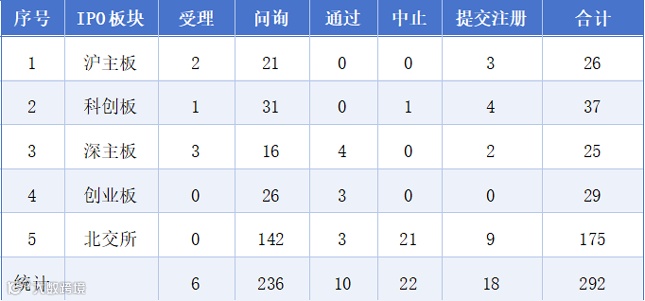 截至8月24日,IPO排队企业292家,其中沪主板排队企业26家,科创板排队企业37家,深主板排队企业25家,创业板排队企业29家,北交所排队企业175家。