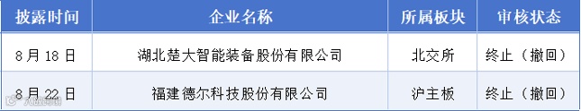 8月18日至8月24日期间,湖北楚大智能装备股份有限公司、福建德尔科技股份有限公司终止(撤回)了IPO。