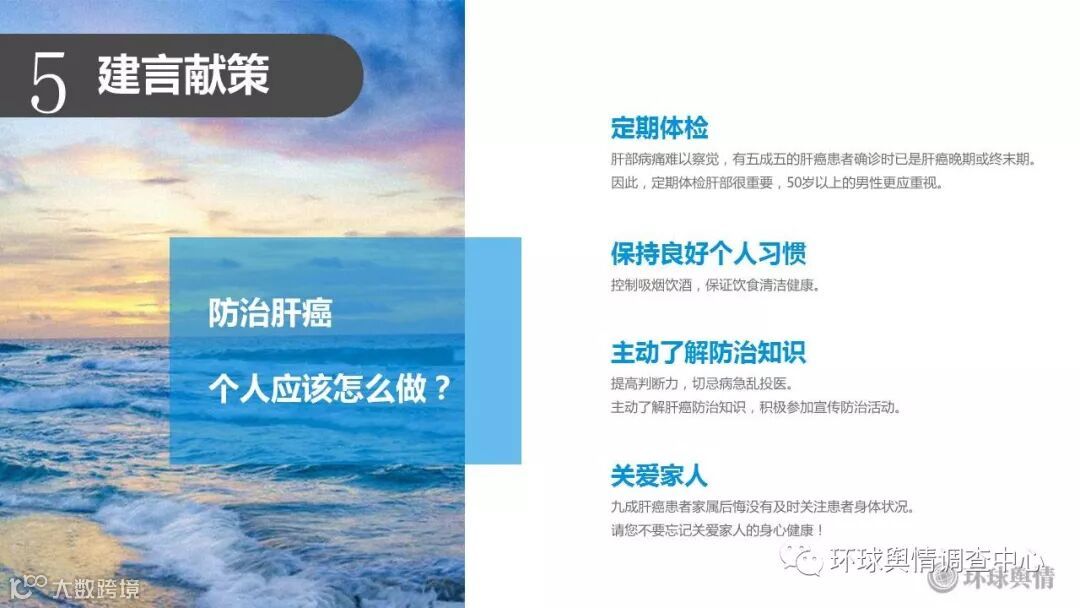 以上就是本次调查的主要发现。根据调查结果,我们也提出了相应的建议和呼吁。首先是为了防止肝癌,个人在日常生活中应当注意的四个方面: