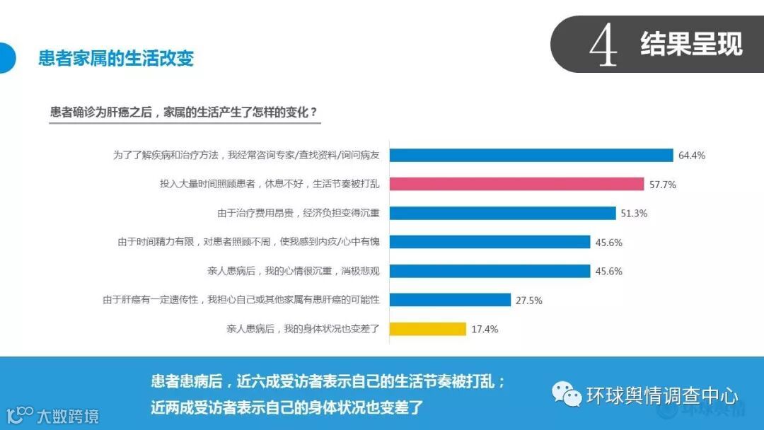 在本次活动中,环球舆情调查中心常务副主任张琪女士正式发布《肝癌患者家庭调查报告》,详细解读了肝癌患者的患病情况、肝癌患者家属的生活变化,并提出相应的建议。