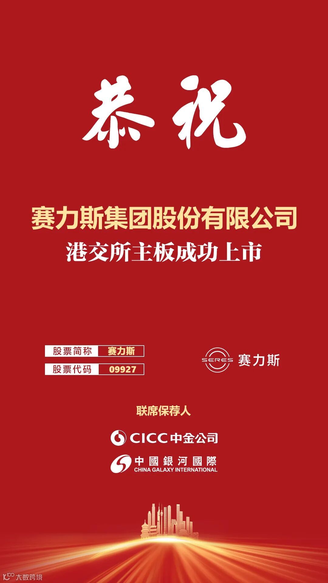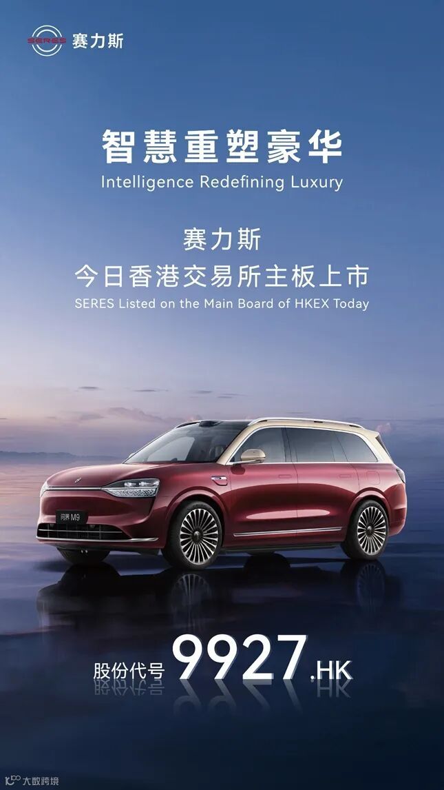 11月5日,赛力斯集团股份有限公司(股票简称:赛力斯,A股代码:601127,H股代码:09927.HK)在香港联合交易所主板隆重挂牌上市,正式成为首家实现“A+H”双平台上市的豪华新能源车企。此次H股发行是迄今为止规模最大的中国车企IPO,也是2025年以来全球规模最大的车企IPO。标志着公司发展迈入全新历史阶段,开启了依托国际与国内双资本平台协同赋能、加速全球化布局与高质量发展的新篇章。