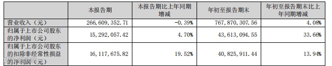 10月25日,宏鑫科技(301539.SZ)发布2025年三季度报告,展现出强劲的增长动能与战略布局成效。前三季度,公司实现营业收入7.68亿元,同比增长4.08%;归属于上市公司股东的净利润达4361.31万元,同比增长33.66%;扣非后净利润4082.59万元,同比增长13.94%,盈利质量显著提升。第三季度单季表现稳健,营业收入2.67亿元,净利润1529.21万元,同比增长4.70%,扣非净利润1611.77万元,同比攀升19.52%,凸显出公司在复杂市场环境中的韧性。