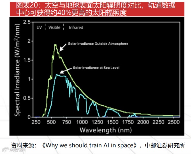 在此背景下,太空算力因太空环境 独特的物理优势,而成为商业航天最具潜力的高价值落地场景与必然演进方向。 太空数据中心太阳能发电效率远高于地面。太空数据中心可全天候(24/7)利用高强度太阳能,不受昼夜更替、天气变化及大气损耗(衰减)影响。根据《Why we should train AI in space》,轨道数据中心太阳能容量因子(发电效率)超过95%,而美国地面太阳能电站容量因子为24%,北欧等温带地区容量因子通常低于 10%。此 外,即使在晴朗天气下,由于大气对太阳辐射的衰减和散射,其峰值发电量也将比地面太阳能电站高出约40%。