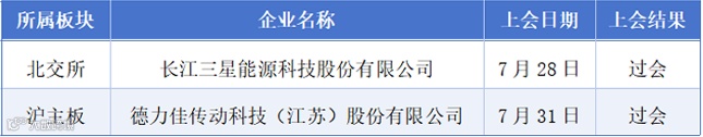7月28日至8月3日期间,长江三星能源科技股份有限公司、德力佳传动科技(江苏)股份有限公司接受了上会审核,并成功通过了整个审核流程。