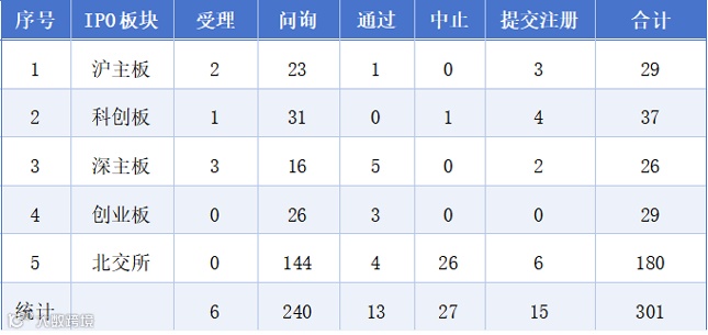 截至8月3日,IPO排队企业301家,其中沪主板排队企业29家,科创板排队企业37家,深主板排队企业26家,创业板排队企业29家,北交所排队企业180家。