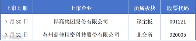 7月28日至8月3日期间,悍高集团股份有限公司、苏州鼎佳精密科技股份有限公司挂牌上市。