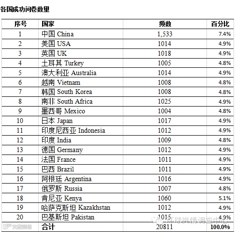 本次调查的时间为2015年10月13日至2015年11月25日。截至11月25日,共回收有效问卷20811份。根据各国官方统计机构公布的人口数据,对被访者的地区分布、年龄、性别和学历进行了配额,各国被访者的人口统计学特征请参考背景资料部分。各国成功完成的问卷数量如下表所示: