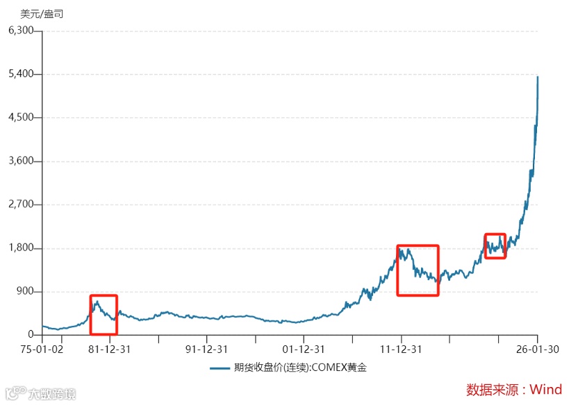 在金本位坍塌之后,黄金进入自由浮动时代,自此出现了几次阶段性大顶。