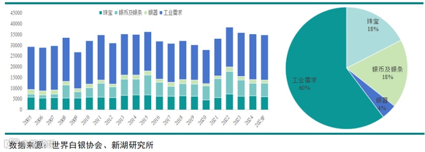 世界白银协会预计2025年全球白银需求为3.6万吨,其中工业需求为2.1万吨,占比为60%。而其工业需求主要来自光伏和新能源车。