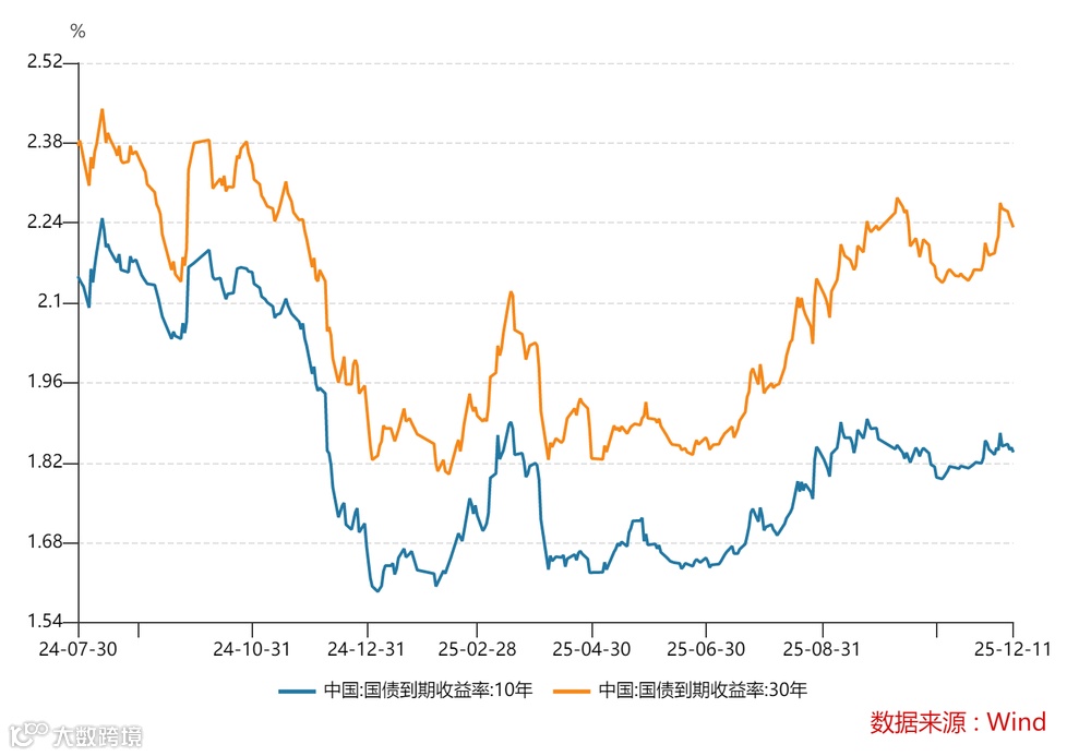 从11月初至12月8日,30年期国债ETF(511090)累计下跌约4%。价格下跌的另一面是,利率几乎单边抬升,30年期国债到期收益率从2.136%持续上行至2.265%。