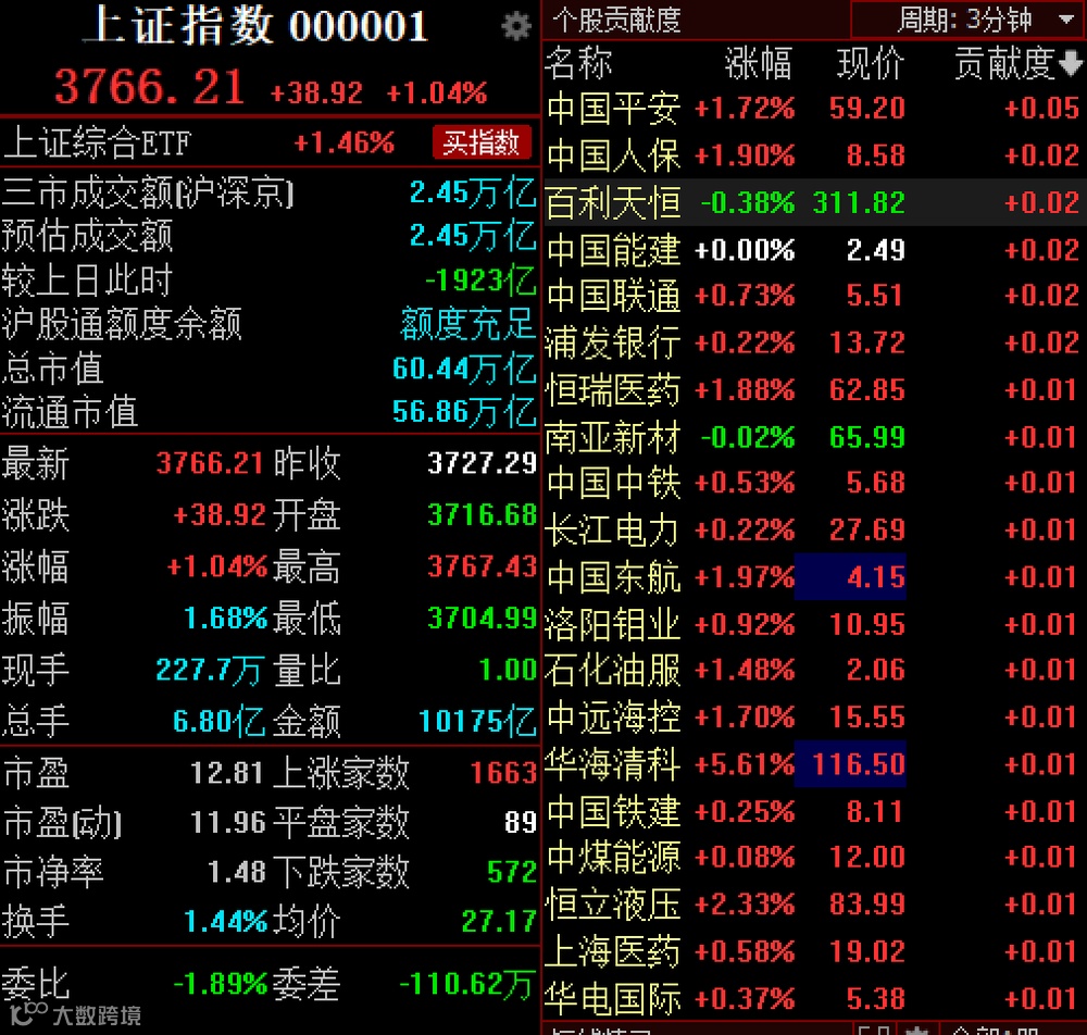 以8月20日个股对上证指数贡献来看,中国平安的贡献度为0.05,中国人保、百利天恒、中国能建、中国联通、浦发银行的贡献度均为+0.02。