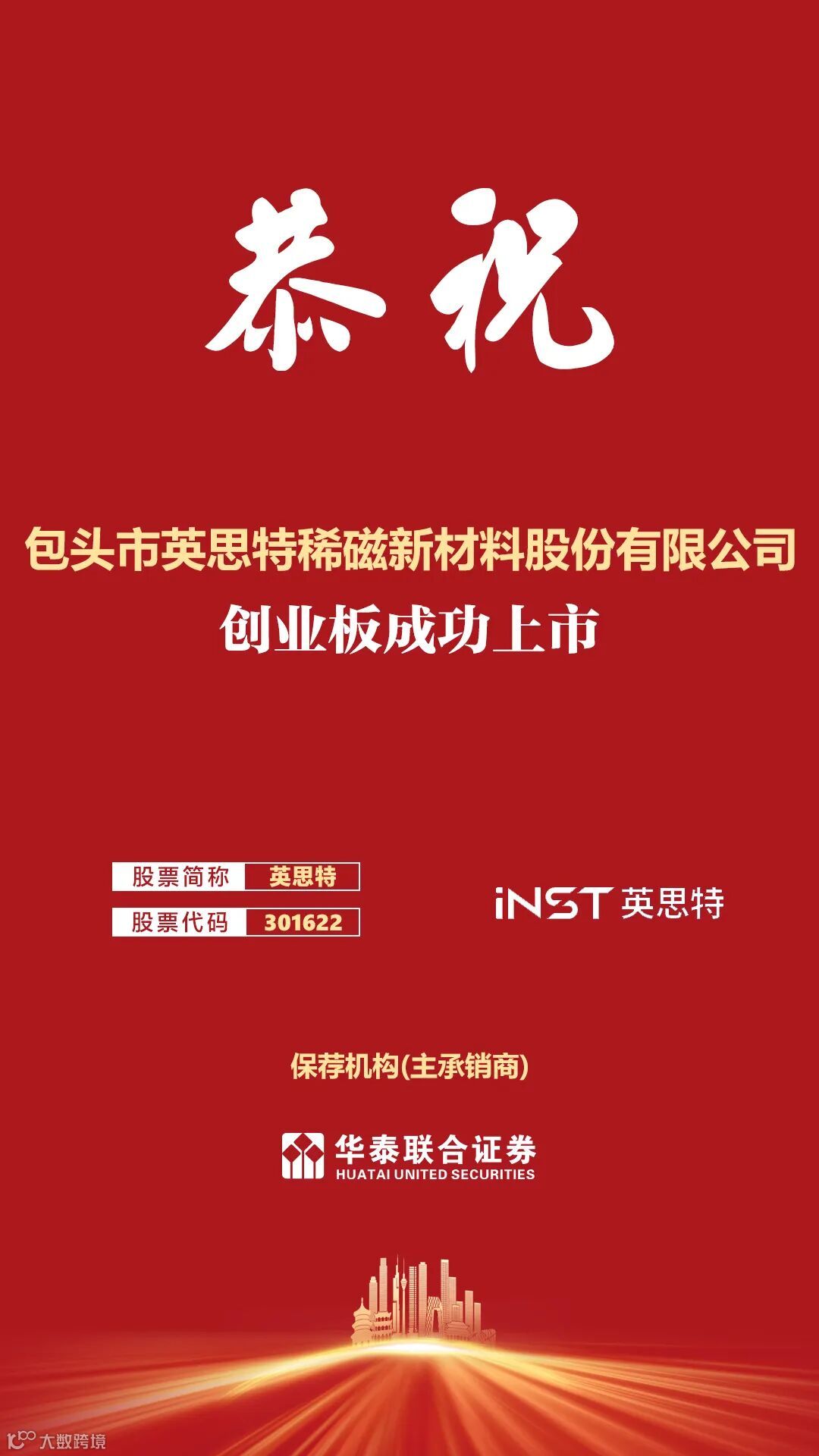 2024年12月4日,包头市英思特稀磁新材料股份有限公司(证券简称:英思特,证券代码:301622),正式于深交所创业板成功挂牌上市。作为稀土永磁新材料应用器件领域领先企业,英思特不断开发新的产品品类,为下游客户提供综合性的磁路工艺技术方案。此次上市,不仅为英思特带来了新的发展机遇,也为其在稀土永磁材料应用器件领域的持续创新和市场扩张提供了强有力的资金支持。同时,这也为投资者提供了一个参与稀土新材料行业成长和分享公司发展成果的机会。