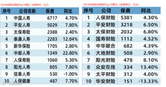 2024年国内保险行业面临利率下行(普通保险产品预定利率由3.0%降至2.5%)、企业降薪和裁员等事件下带来的经济预期转弱等压力,全年原保险保费收入5.7万亿元,同比增速由2023年9.1%放缓至5.7%。
