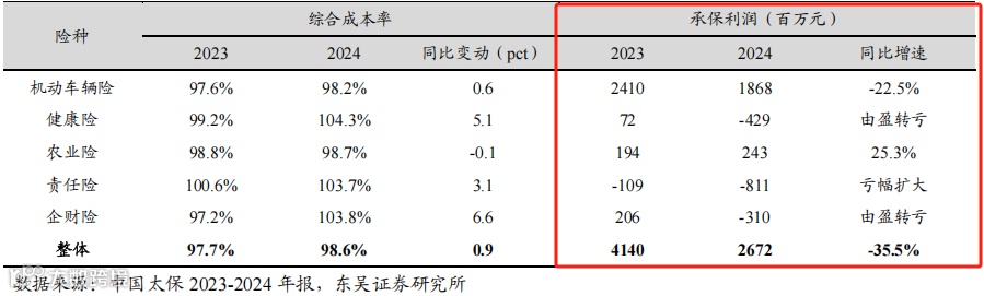但要注意的是,2024年受到台风等灾害导致公司农险、车险等业务赔付上升,对业绩的拖累较大。同时,结合2023年上半年业绩会上太保产险总经理曾义所述,新能源车出险率高出燃油车出险率近一倍。所以若未来随着下游新能源车销售推广,太保的新能源车险销售增加情况下,公司的车险利润大概率会进一步承压。