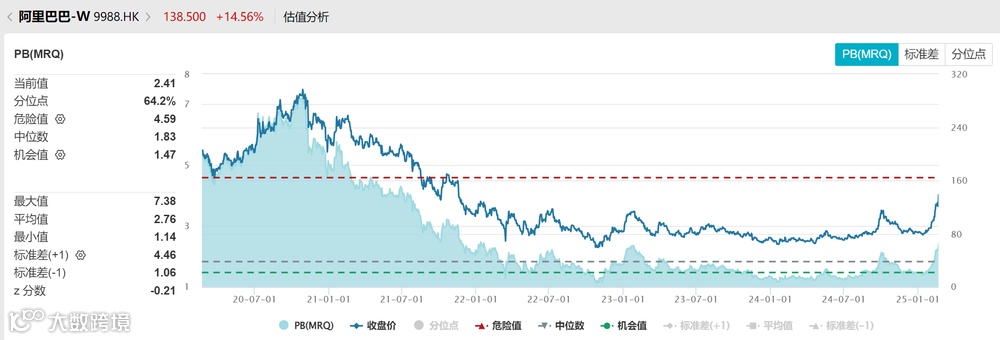 截至2025年2月,中概互联网指数的PE(TTM)为25.7倍,仍显著低于纳斯达克100指数的36.7倍。以阿里巴巴为例,其市净率(PB)从1.15倍的低点回升至2.41倍,但距离历史中枢(3倍)仍有一段距离。