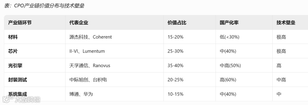 CPO产业链呈现金字塔结构,各环节技术壁垒与价值分布不均,上游材料与设备中,硅光芯片决定光转换效率的核心材料,25G以上芯片国产化率不足30%;磷化铟衬底是高端激光器关键材料,被日美企业垄断。中游制造与封装环节,光引擎集成占据CPO价值占比40%,技术壁垒最高;测试验证环节成本占产品总成本25%以上。