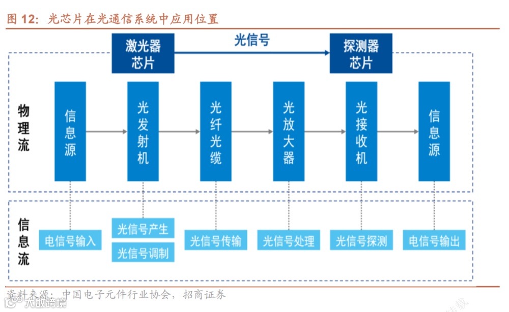 光通信行业上游原材料主要由光/电芯片、PCB等构成,中游光器件包括光组件(有源组件、无源组件),光组件通过不同封装方式构成光模块。在下游用于光通信系统设备中,主要面向电信运营商、云服务厂商、数据中心厂商等领域。