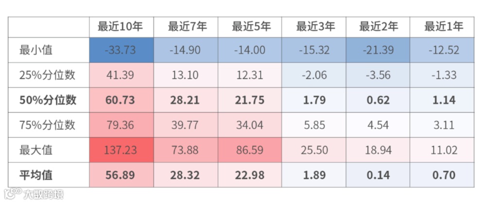 只是这样的超额水平,很难保证较平均地分布在每年,就不太容易让每个年份里进来的投资者多数能挣到钱。