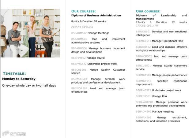 开设课程有Diploma of Business Administration(CRICOS 093146A)以