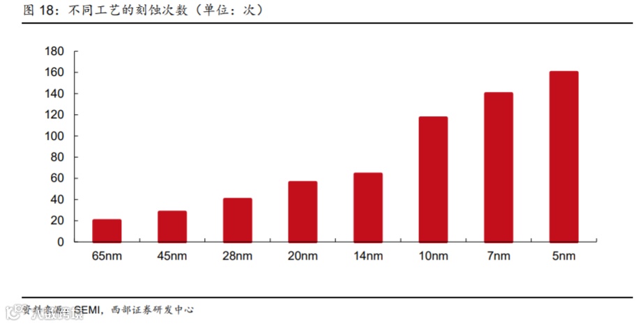 每次芯片制程的提升,都会导致刻蚀步骤的成倍增加,工序步骤的大幅增加意味着需要更多刻蚀设备。