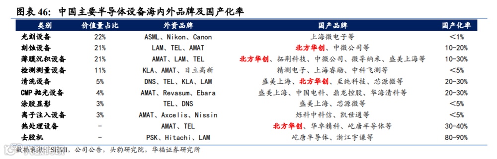 据机构统计,北方华创所在的刻蚀设备、薄膜沉积设备、清洗设备、热处理设备的国产化率分别为10% - 20%、10% - 30%、20% - 30%、30% - 40%。