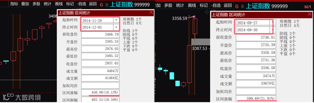 对于走势形态,最近2周涨幅和2014年11月行情爆发的前两周涨幅也很相似,在2014年11月21日央行超预期降息后,上证指数2周内上涨了18.13%,这两周上证指数上涨了21.9%。