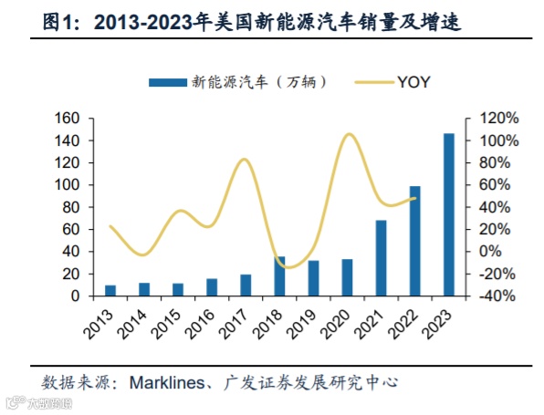 在美国新能源车市场方面,据Marklines,2023年美国新能源汽车销量148万辆,同比增长49.6%;新能源汽车渗透率为9.1%。截至2024年9月,美国新能源汽车的渗透率为10.50%。其中,纯电动汽车的市场渗透率为8.90%,较2023年9月提高了1.1个百分点。