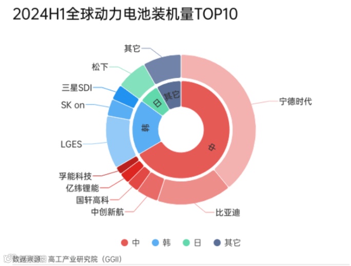在动力电池领域,据GGII统计,2024上半年全球动力电池TOP10依次为,宁德时代、比亚迪、LGES、松下、中创新航、SKon、三星SDI、国轩高科、亿纬锂能、孚能科技,合计装机约317.8GWh,占动力总装机量的92%。