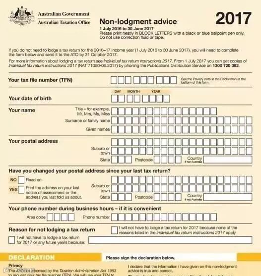 还有即便是无收入的人或年收入低于$18200的居民,也必须要在每年6月30号之后递交一份“无收入声明表”(Non-Lodgement Advice)给税务局。