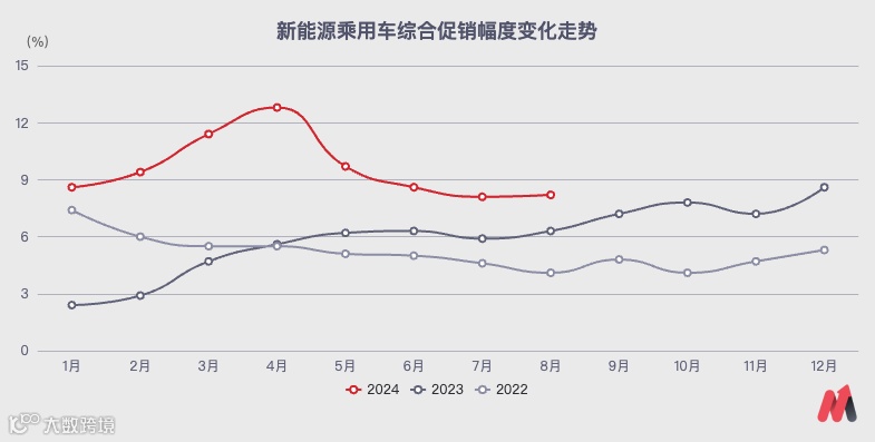 新能源市场新品数量逐年增加,在细分市场产品更密集、竞争更激烈之余,还推动了全市场的“价格战”。尤其从去年年中开始,新能源乘用车的促销幅度就开始持续攀升,最终在今年4月创下了12.8%的新高。