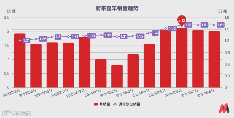 蔚来品牌的销量从今年4月开始快速回升,强势遏制了“月滚动销量”(过去12月总销量求平均,消除淡旺季销量波动)的下滑趋势,逐步将月销量和月滚动销量提升到了2万辆/月和1.6万辆/月的水平。