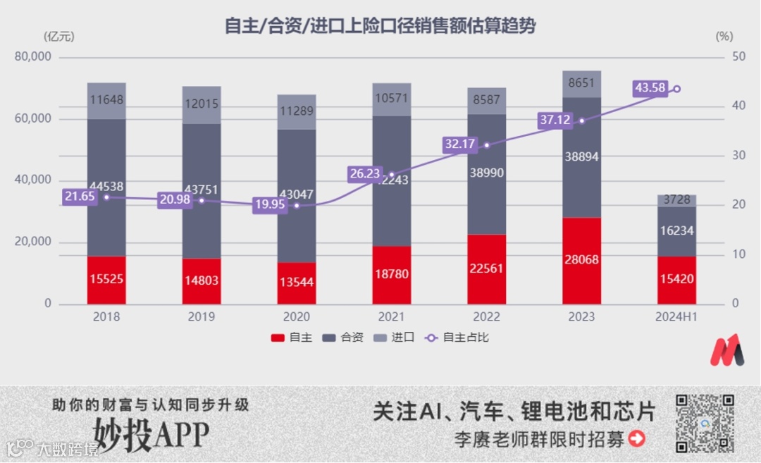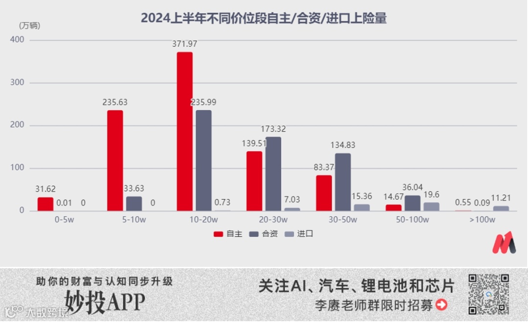 相比销量数字,对于自主汽车产业来说更重要的其实是销售额和利润的占比。虽然今年上半年自主车企的豪华和超豪华市场的上险量数字仍不及合资和进口,但从市场整体分到的销售额占比已经来到43%。考虑到豪华和超豪华市场普遍拥有更高的毛利润率,能够进入自主车企“腰包”的利润应该已经接近40%。