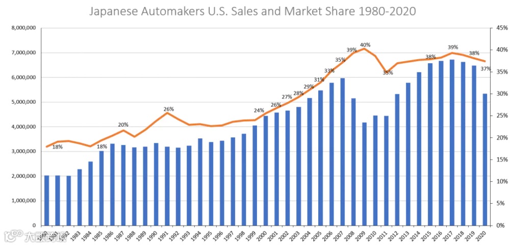 日本汽车制造商1980~2020年在美销量和市场占比,图自 JAMA