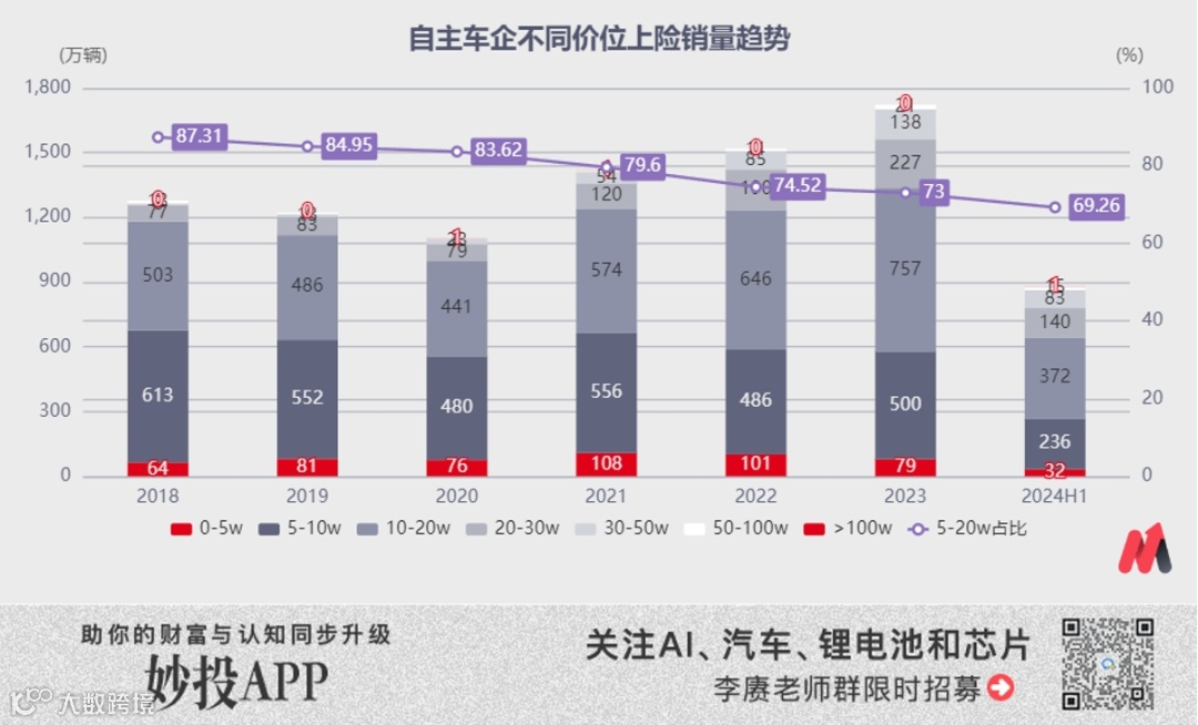 如果说合资车企们的临时降价是“亡羊补牢”,自主车企们在主流市场只能说是“避无可避”。就拿今年上半年的数据来说,自主车企“5万元~20万元”(按指导价计算,实际成交价更低)的销量占比才刚刚降到70%以下。几乎所有自主车企的所有品牌,在“A级~B级”细分市场中,都进行了一连串产品布局,同一个消费需求下7、8款“自主+合资”产品互相PK的情况已经成为了常态。