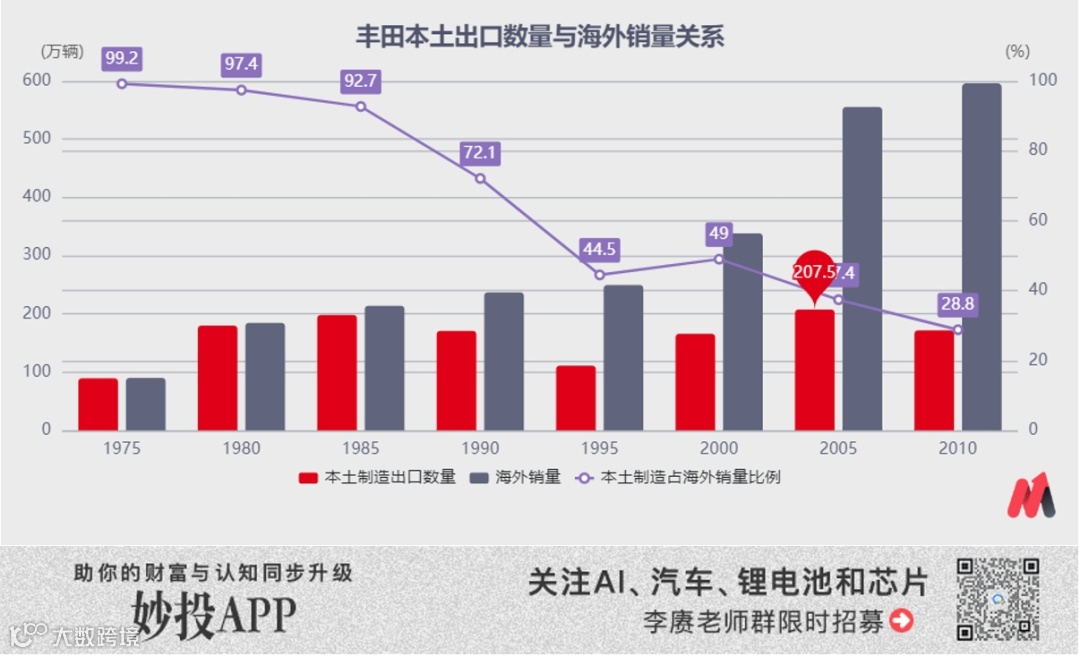 凭借这些新增的海外产能,丰田不仅成功地在1990年~1995年将出口占海外销量的比例直接降到了50%以下,更非常丝滑地完成了“产品出口规模化”向“海外运营本地化”的过渡,并且以市占比为基础逐步实现了产品和品牌层面的“经营布局全球化”。最终让丰田成为了全球最大的汽车制造商,并且长期稳居这一宝座。