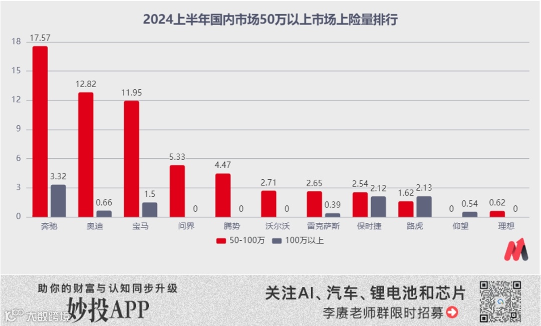 以50万的超豪华市场销售情况为例,2024上半年,有且仅有三个自主品牌获得了销量的高速增长: