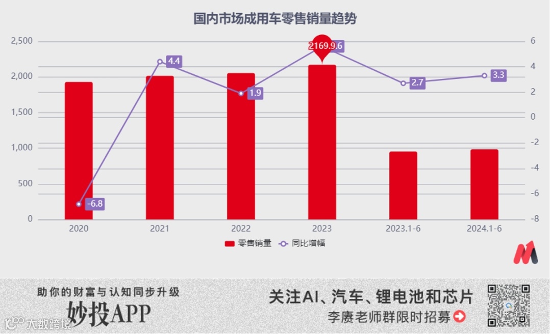 汽车消费力走弱的最好证明,是“价格战”背景下的销量变化,2023年中国乘用车零售销量涨幅不到6%,2024年上半年销量增幅只剩3.3%。