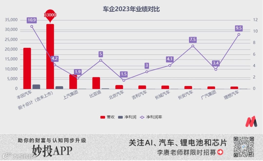具体到企业层面,以行业中拿走利润大头的车企为例,中国前十大车企2023年凭借2315万的销量,仅仅拿到了不足2000亿元利润(一汽和奇瑞未上市,对应利润为估算),换算成净利率刚过4%(除了理想)。对比之下伤害更大,全球最大车企的丰田同期用1031万的销量就实现了2280亿元人民币的净利润,换算成净利润率11%,大约是国内车企的3倍。