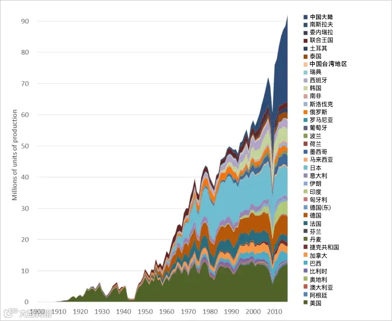 1900-2016 年全球汽车生产 (含轿车、卡车和公共汽车),图自 Darrin Qualman,数据自USDT、NTS