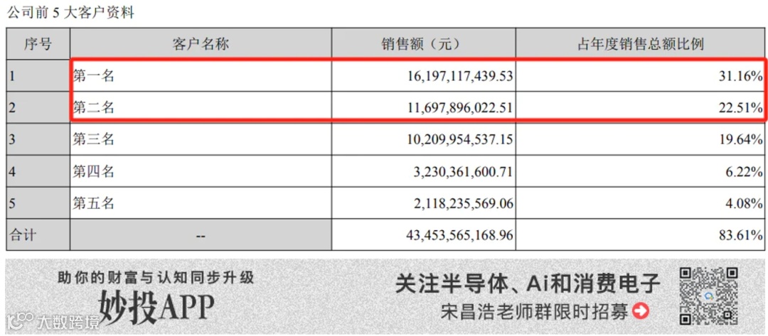 在2019年之前,欧菲光可以说是手机产业链上的核心标的,公司手握华为以及苹果全球两大手机客户。根据2019年年报显示,当年公司的前五大客户中,华为是第一大客户,贡献营收31.16%,苹果为其第二大客户,贡献营收22.51%。