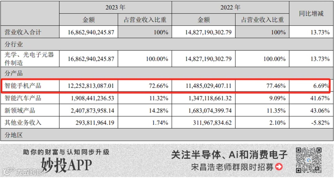 根据最近一年的年报显示,2023年公司来自智能手机的营收122.5亿,占到公司总营收的72.66%,来自汽车产品的营收19.08亿,占到公司总营收11.32%,来自新领域产品的营收24.07亿,占到公司总营收的14.28%。