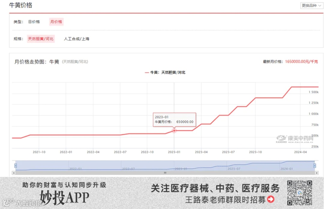 天然牛黄的供应受限,因而在下游需求高景气的状态下,价格持续上涨。康美中药网的数据显示,2023年初每公斤天然牛黄的价格仅有65万元,而目前已经上涨到165万元,涨幅超过150%。