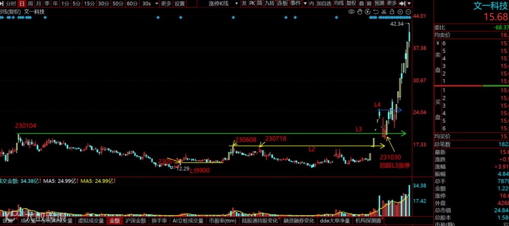 连续涨停后如果还想参与,怎么办?要看后续有无回调。文一科技23年1月4日绿色水平线是前期的一个左峰阻力线,所以其从一字板上去之后,很友好地又回调到了绿色水平线,并在1月30号再次回踩水平线后涨停。