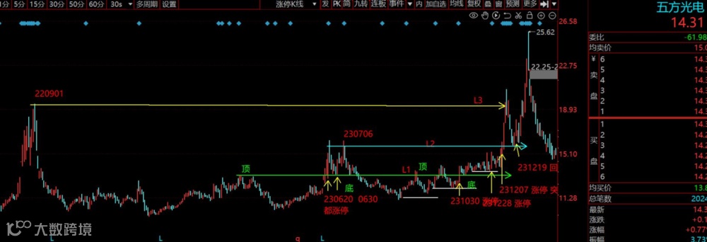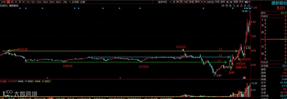 从这张图可见其有三条阻力线。L1绿色水平线上标注出了多个顶和底,被10月30日的涨停突破,而11月28日的涨停已经接近L2压力线。