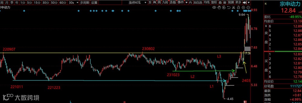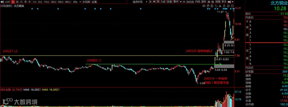北方铜业在2024年3月14日一字涨停,且是跳空在2023年8月2日形成的绿色阻力线L1之上。