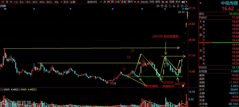 中视传媒1月18日后又出现了两次涨停,中间加一个阴线,这就是一个大阳反包。之后它连续一字板涨停没机会买,只能在它前面出现N字形走势之后回调得到了支撑,且基本面没问题,又和当时的风口相吻合,那可以在绿色水平线附近做一次试错,不然的话这种股票可能对普通投资者没有特别好的买点。