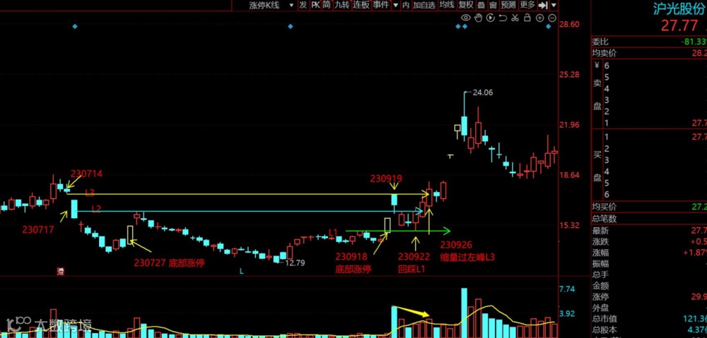 第1个涨停在阻力位之下,仍处于大的盘整结构,是从黄金坑里边在往上走的过程中,并没有一个特别显著的标识。