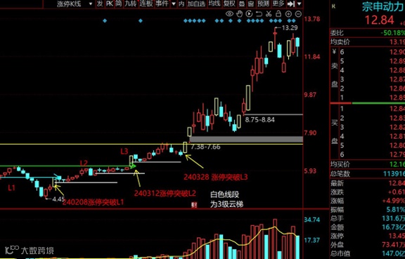 因此绿色水平线就非常关键。23年9月26日出现一个涨停,突破了绿色水平线。从12.55元开始,三条白色线段也像三节云梯,且第三条白色线段和绿色线在同一水平线上。