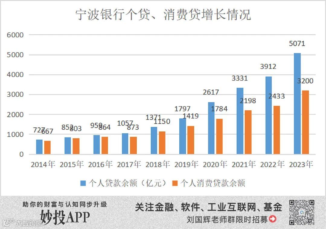 这也使得宁波银行的个人贷款明显提速。2014年到2023年,宁行个贷规模从727亿元涨到了5071亿元,涨幅惊人,助推了业绩增长,在零售金融领域有了一席之地。
