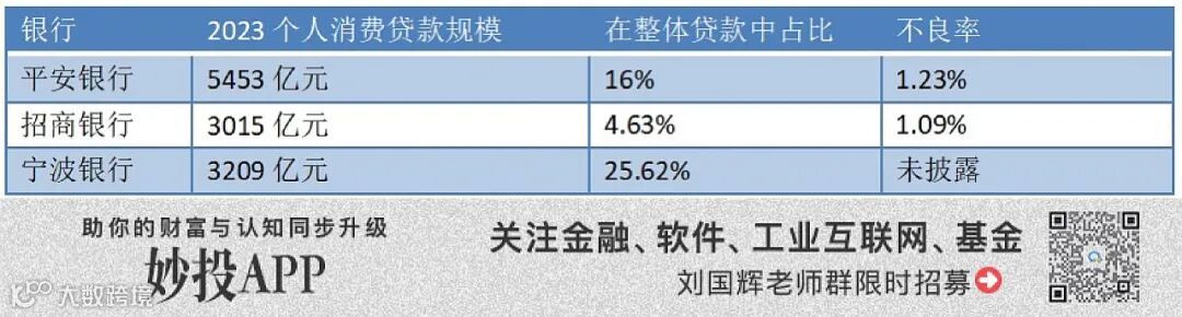 与招行相比,宁波银行个人贷款规模5071亿元远不及招行的22253亿元,因为招行有1.3万亿的房贷。而在消费贷上,宁波银行已经达到3200亿元,超越招行。